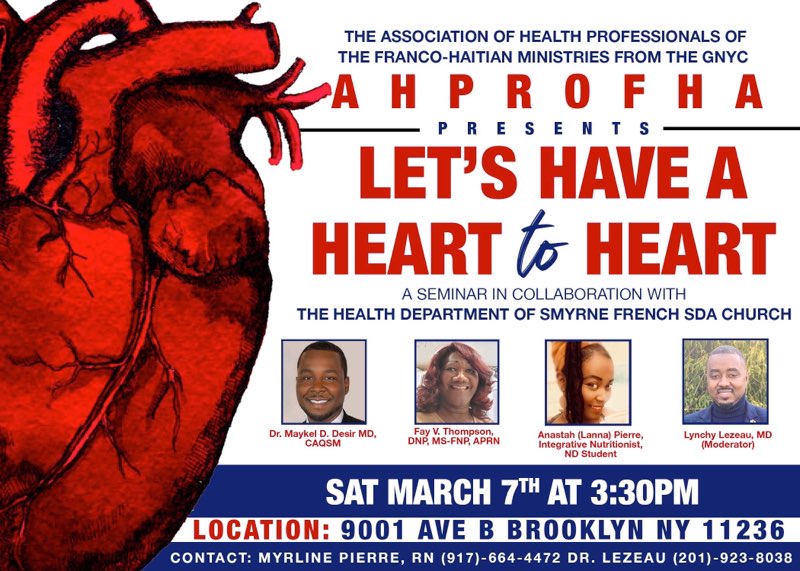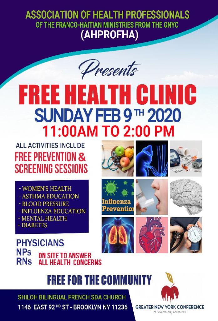 By God’s grace, we have developed a model of a Free Health Clinic for Brooklyn and Long Island communities. In 2019, with a group of Medical Doctors and Nurses, we have formed an Association Health Professional of Franco-Haitian Ministries from the Greater New York Conference (AHPROFHA). This association offers Free Health Clinic to the communities.